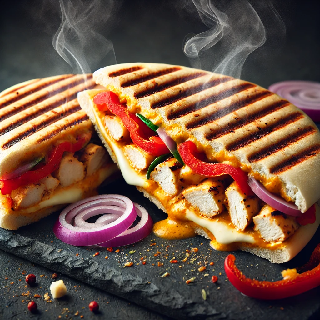 Currysaus, kip, paprika, rode ui en mozzarella